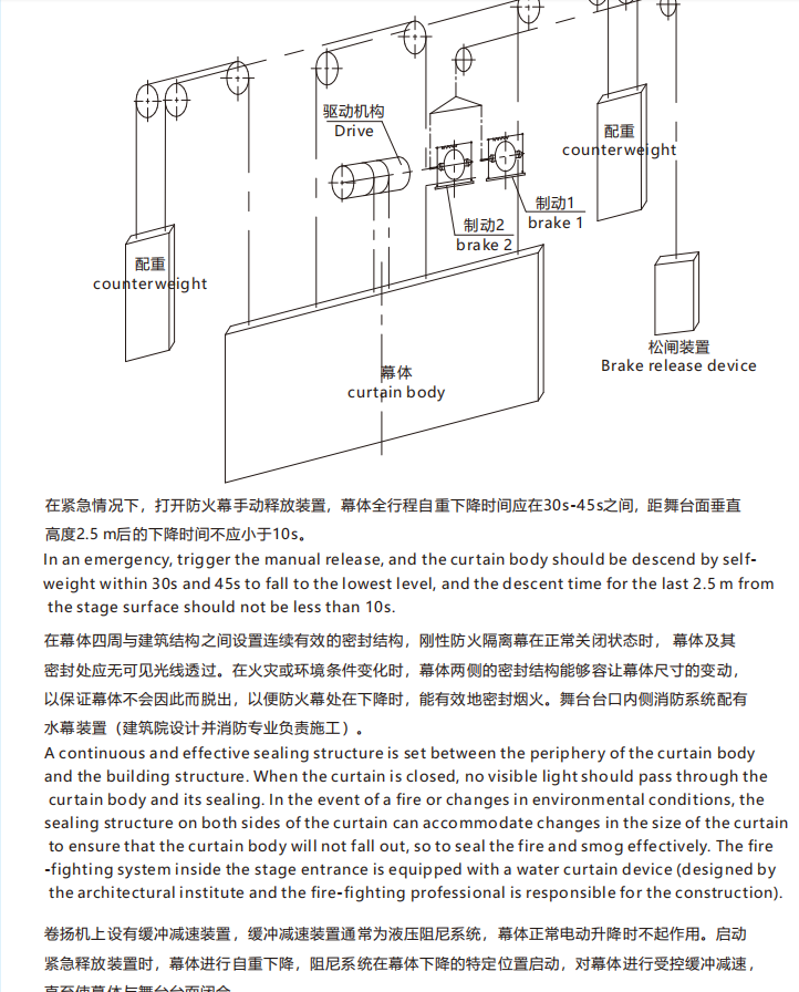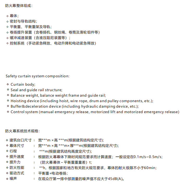 厅或舞台以外的区域,起到防止火灾蔓延的作用。防火幕幕体为刚性结构,是通过卷扬方式垂直升降的设备。